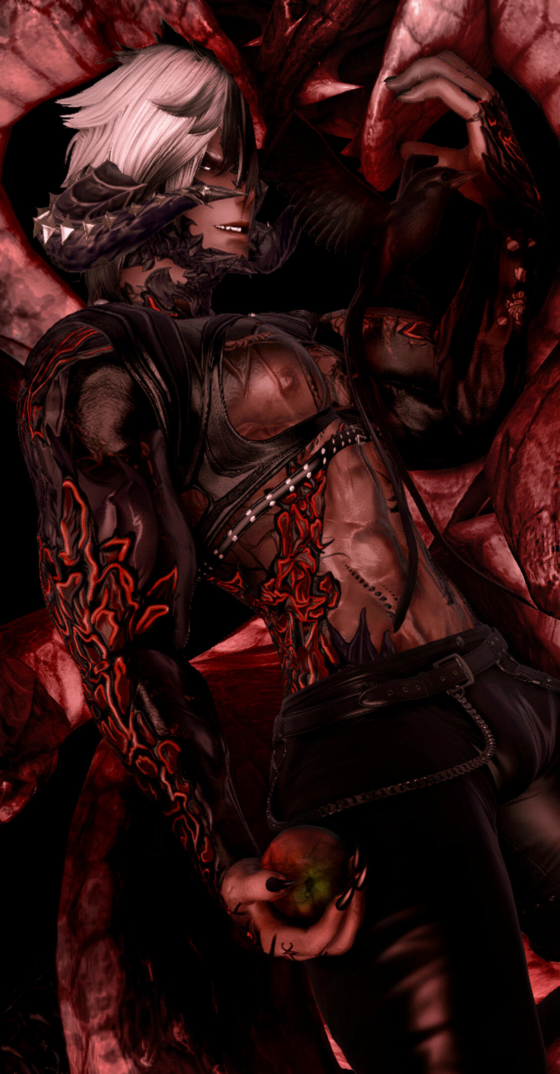 Having outlasted many lifelines longer than the common Au Ra, it's likely that he was created through unnatural means. Although his laboratory records do not reveal his true origins- aside a name, it is speculated that he is likely the result of a Voidsent pact.As a child, he was seized from the ruins of Tam-Tara Deepcroft when a number of researchers and adventurers went missing after entering its grounds, prompting high level mages to investigate. Among the corpses of both people and monsters, a child with dark Aether resided in the corner; anyone who approached would be snuffed out of their life energy. Magic was used to suppress his abilities so he could be brought back to the Underground Research Facility for further study.They were able to learn of his unique Aether through their research, though they were never able to discover its origins. The darkness inside him acted as a poison to those close. In addition, a small amount resided within his right eye, destroying the cells and resulting in blindness. Extreme amounts of natural aether weaken him, so his own destroying it acted as a natural defence response.Despite the torture his body endured, Kijin did not seem bothered by the painful research. In fact, he was so intrigued by it all be began experimenting on himself. He began demanding more intense and painful treatments. When the researchers refused, he became frustrated and began killing those who did not abide by his decisions. Those who feared for their lives agreed to carry out his requests, which eventually led to Kijin gaining control of the Laboratory.With a wave of new subjects to experiment on at his disposal, he tirelessly went through all the research files, introducing intense and fearsome new procedures. After becoming intrigued by the psychological distress that his new employees experienced when carrying out his orders, he devised even harsher forms of testing to see how far he could push them before they turned to extreme measures, or even became completely numb after experiencing overwhelming trauma. Increasingly obsessed with experimentation, he opened smaller facilities throughout Eorzea, dipping into the black market to expand his connections and resources. As a result, he has been able to acquire jobs in order to expand his research specimens and employees, if he ever grow tired of them, he will sell them back to the Black Market, or dispose of them himself.In the years that have passed, he has gained extensive knowledge on controlling his abilities, actively pursuing individuals with high levels of Aether with the hope of feeling his body break down the closer he gets to them; no levels have been high enough to counteract his poison effectively enough, but he loves exploring the prospect of finding one powerful enough that could potentially kill him.In his attempts to absorb natural Aether, he has implemented numerous methods, including overexposure, sexual intercourse, and consumption, but thus far nothing has worked, instead- developing an insatiable appetite for flesh, to the point of sharpening his teeth to easily consume and digest tougher skin.